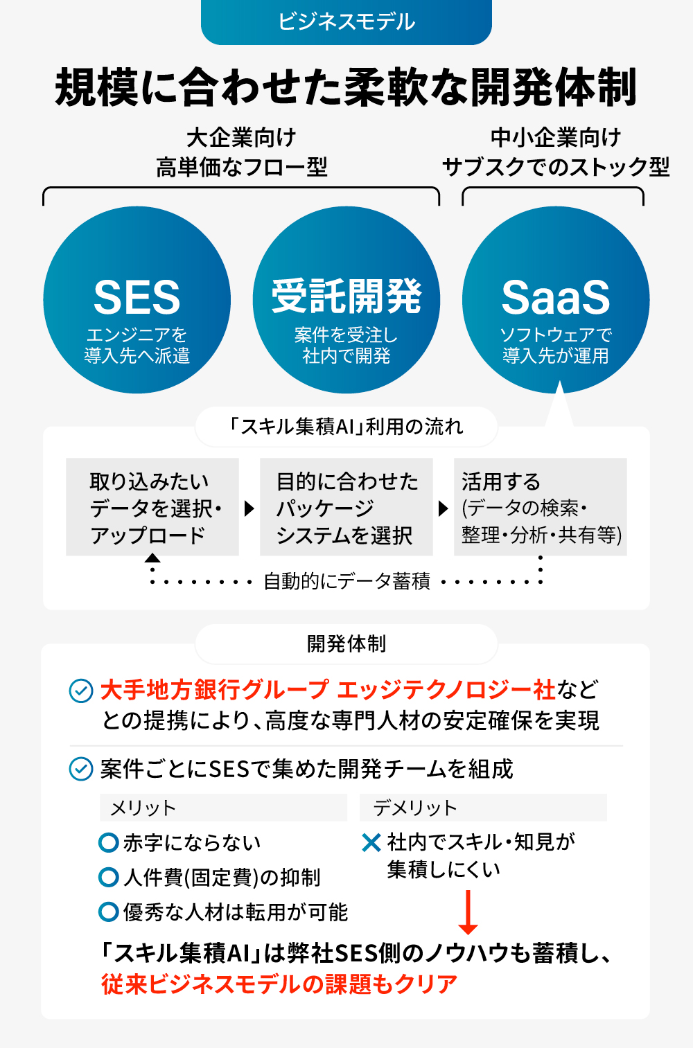 開発体制においては、大手地方銀行グループである元上場企業エッジテクノロジー株式会社などとの業務提携を通じて、高度なAI人材を安定的に確保する体制を構築しています。各案件に必要な人員は、案件ごとにSESで集めることで、赤字リスクの回避、人件費などの固定費抑制、優秀な人材の囲い込みや転用が可能となります。従来のSES型ビジネスモデルでは、社内にスキルや知見が蓄積されにくいという課題がありましたが、「スキル集積AI」はその構造的な課題を解消する新たなアプローチとなります。